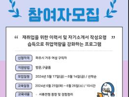 파주시는 여성 취업준비 프로그램인 ‘입사서류 작성법’의 참여자 15명을 5월 17일부터 6월 14일까지 모집한다고 밝혔다. 해당 과정은 구직 여성들이 노동시장의 변화를 인식하고 자신의 역량을 분…