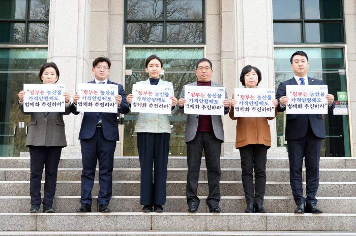 경기 파주시의회 더불어민주당 (대표의원 손성익) 의원 전원은 14일 파주시의회 입구 계단 앞에서 기자회견을 열고 농산물 가격안정제도의 법제화 추진 촉구를 위한 결의문 낭독과 피켓 퍼포먼스를 개최하는 등 결의를 다졌다.