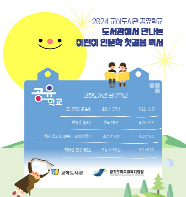 파주시교육지원청과 교하도서관이 협업으로 진행하는 공유학교는 인공지능 시대에 더 강조되는 인문학을 어린이·청소년들이 공부가 아닌 놀이와 이야기로 접할 수 있도록 준비했다. 교하도서관 공유학교는 4월 3일부터 모집을 실시했으며 22일 첫 수업을 시작으로 해솔, 한빛 도서관도 5월부터 시작된다.