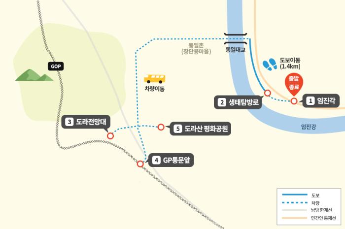 평일 오전과 주말에 이용할 수 있는 1코스는 임진각부터 출발하여 생태탐방로, 도라전망대, 도라산평화공원을 둘러보는 여정이며, 평일 오후에는 운영되는 2코스는 기존 1코스에 남북출입사무소(출입경)와 도라산역을 경유하는 노선이 추가된 여정이다.
