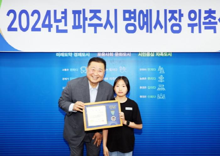 이날 명예시장으로 위촉된 신지온 학생은 지난 2월 강원도 평창군에서 개최된 제105회 전국동계체육대회 스노보드 평행대회전(여자 12세 이하부)에서 동메달을 획득해 파주시의 위상을 높인 바 있다.