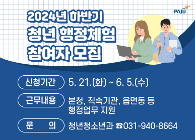 파주시는 오는 21일부터 6월 5일까지 2024년 하반기 청년 행정 체험 참여자 20명을 모집한다고 밝혔다.