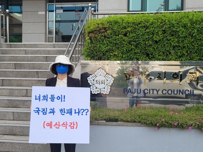 5월 17일 파주시의회 앞에서 피켓을 든 한 시민을 만났다. “너희가 국짐(국민의힘)과 한패냐? 모빌리티 예산삭감 원상 복구하라!” 외치는 그녀에게 무슨 일로 아침부터 이곳에 오게 되었는지 이유를 물었다. 그녀는 14일에 열린 제246회 임시회 2차 본회의에서 파주시의회가 제1차 추가경정예산 삭감을 한 것에 대해 강한 불만을 품고 있었다. 특히 파주시가 핵심 사업으로 추진 중인 ‘파주시 모빌리티 개선계획 수립 용역’ 사업비 2억140만 원이 전액 삭감된 것을 지역 신문으로 접하고 항의차 방문했다고 한다.
