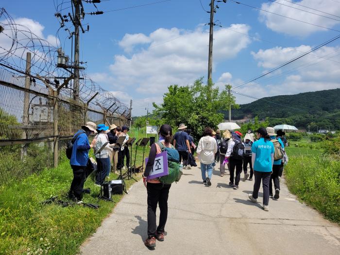 지난 5월18일 파주시 민통선 안 ‘임진강변 생태탐방로’에서 ‘2024 경기여성 DMZ평화걷기’가 있었다. ‘경계너머 ~연대’라는 슬로건으로 모인 약 300여명의 참가자들은 6·25전쟁 납북자전시관 앞에서 출발, 임진각을 에워싸는 민간인통제선 안의 ‘임진강변생태탐방로’ 철책을 따라 임진각, 통일대교, 초평도, 율곡 습지공원까지 약 9.1 킬로미터를 함께 걸으며 평화를 만들어가고자 하는 여성들의 다짐과 여성 평화 의제를 다시 한번 되짚어보는 의미 있는 시간을 가졌다.