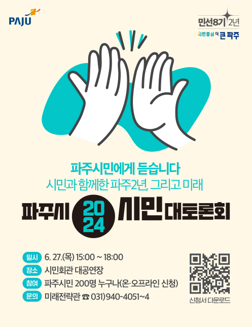 민선8기 출범 2주년을 맞아 파주시는 지난 2년 시정을 평가하고 향후 2년의 발전방향을 모색하는 ‘파주시 2024 시민 대토론회’를 개최한다.