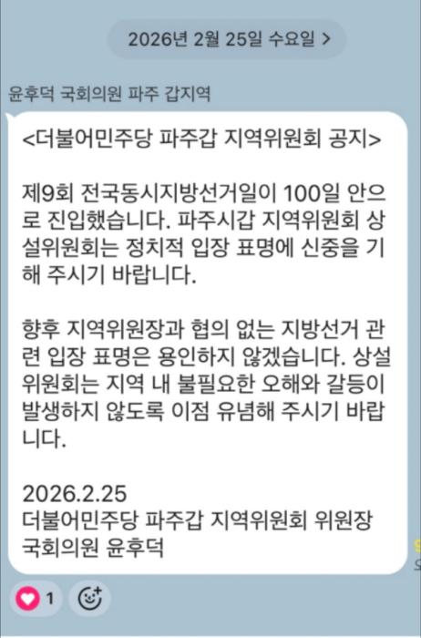 ▲ 2026년 2월 25일, 더불어민주당 파주갑 지역위원회(위원장 윤후덕 국회의원)가 발송한 공식 공지문. 제9회 전국동시지방선거를 앞두고 상설위원회의 정치적 입장 표명에 신중을 기할 것과, "향후 지역위원장과 협의 없는 지방선거 관련 입장 표명은 용인하지 않겠다"는 엄중한 경고를 담고 있다.