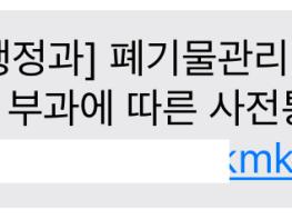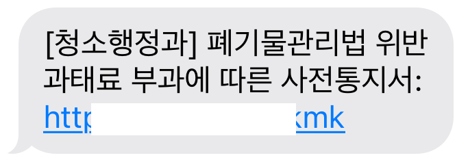 최근 폐기물관리법 위반 과태료 부과에 따른 사전통지서라는 내용의 문자메시지를 받았다며, 시 자원순환과에 문의하는 전화가 증가하고 있다. 그러나 파주시청에는 청소행정과라는 부서가 없으며, 폐기물관리법 위반 과태료가 부과될 경우 문자가 아닌 고지서 우편물을 발송하고 있다.