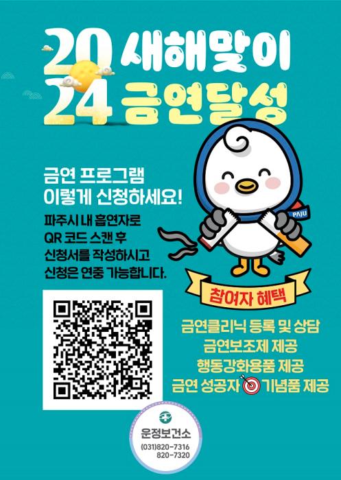 파주 운정보건소는 흡연자의 금연을 돕기 위해 ‘금연클리닉’을 운영하고 있으며, 금연을 희망하는 시민들이 간편하게 등록할 수 있도록 정보무늬(QR코드)를 개설했다.