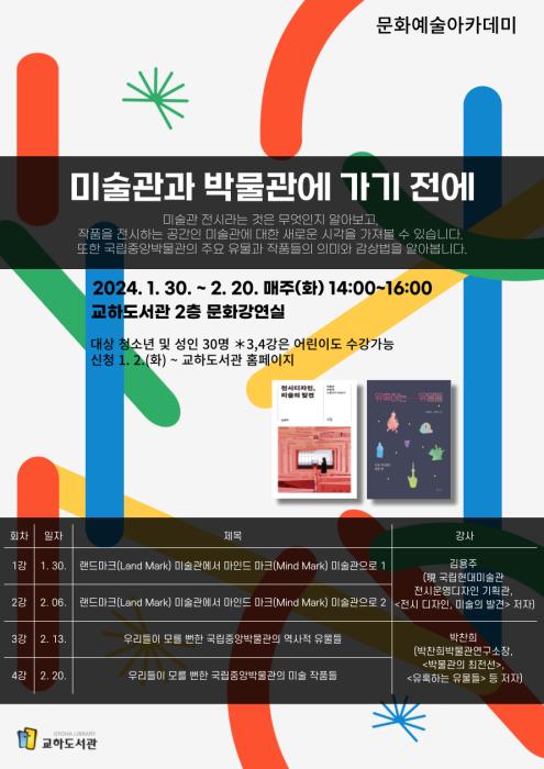 파주시 교하도서관은 박물관, 미술관 관람의 인기가 높아지는 추세를 반영해 강연 프로그램인 ‘문화예술아카데미-박물관과 미술관에 가기 전에‘를 운영한다.