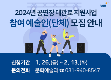 신청 희망자는 서류를 준비해 지방보조금관리시스템(보탬e)에서 신청하면 된다. 자세한 내용은 파주시 누리집 고시공고 게시판 또는 지방보조금관리시스템(보탬e)을 확인하거나 문화예술과 예술공연팀(☎031-940-8547)으로 문의하면 된다.