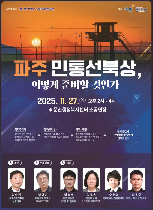 행사는 북파주발전포럼 김순현 상임대표가 좌장을 맡고, 박영민 대진대학교 교수가 ‘DMZ 연구와 접경지 발전’을 주제로 발표한다.